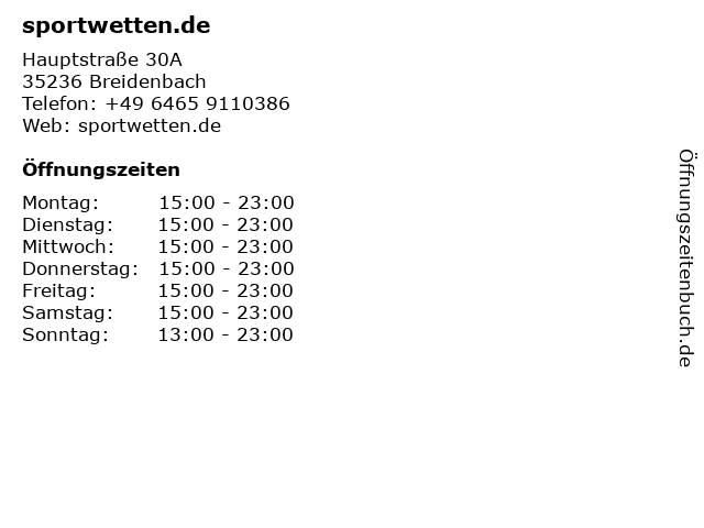 | Öffnungszeiten sportwetten.de in Breidenbach anzeigen | |