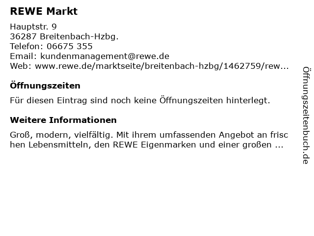 | Öffnungszeiten REWE Markt in Breitenbach-Hzbg. anzeigen | |