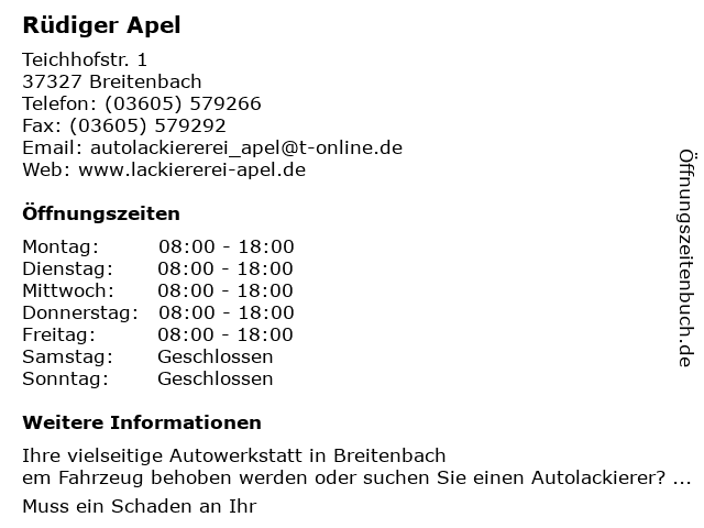 | Öffnungszeiten Rüdiger Apel in Breitenbach anzeigen | |