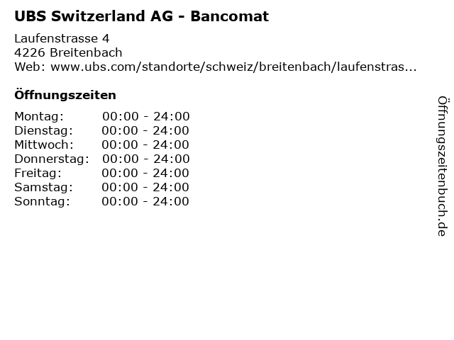 | Öffnungszeiten UBS Switzerland AG - Bancomat in Breitenbach anzeigen | |