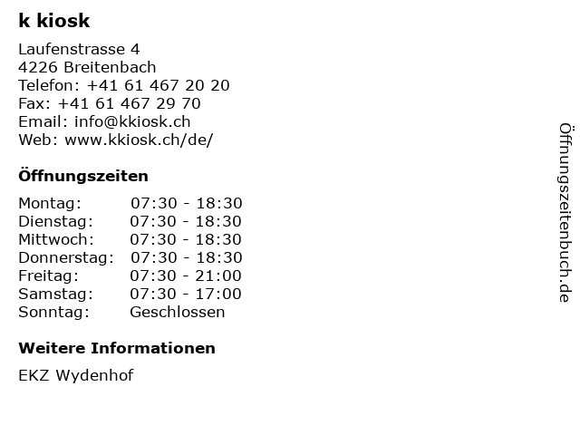 | Telefonnummer k kiosk in Breitenbach (+41 61 467 20 20) anrufen | |