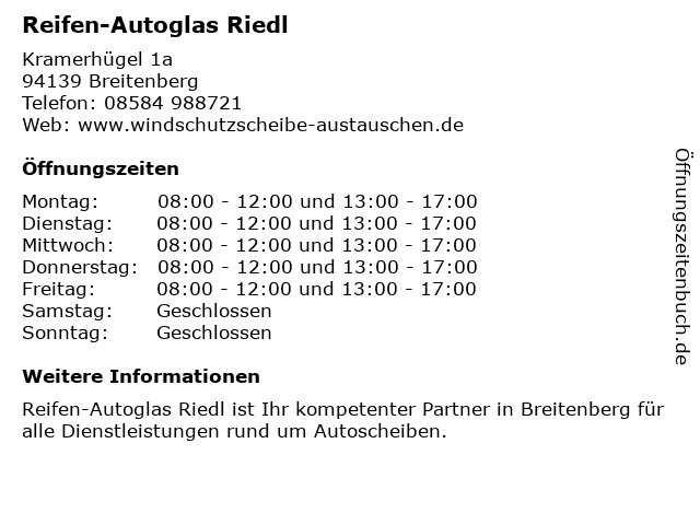 | Öffnungszeiten Reifen-Autoglas Riedl in Breitenberg anzeigen | |
