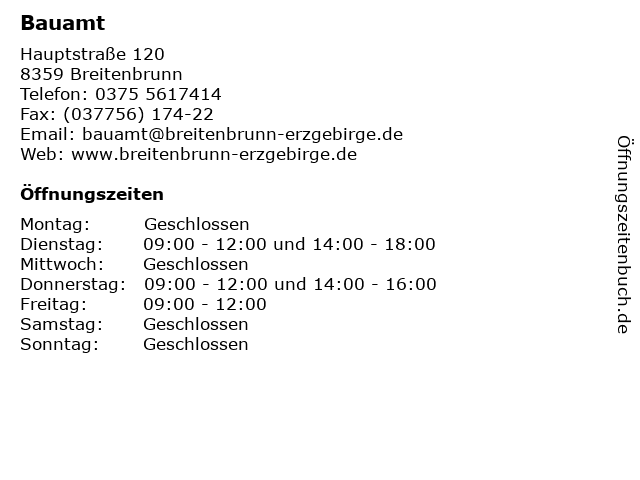 | Öffnungszeiten Bauamt in Breitenbrunn anzeigen | |