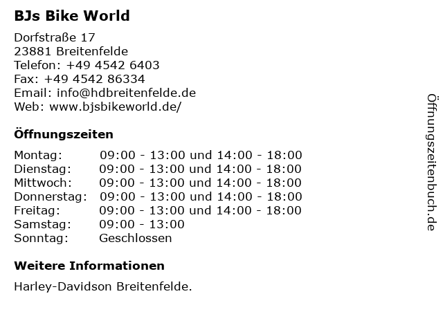 | Öffnungszeiten BJs Bike World in Breitenfelde anzeigen | |