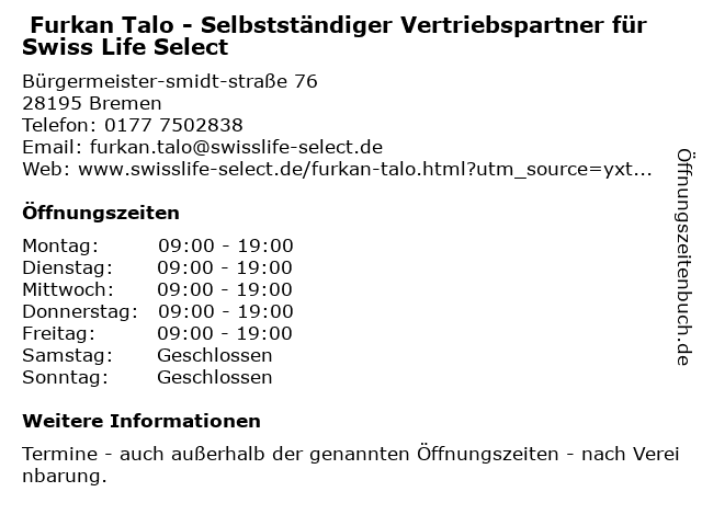 1 Kian Reza Abnussi - Selbstständiger Vertriebspartner für Swiss Life Select (Entfernung: 0,01 km) Bürgermeister-smidt-straße 76, 28195 Bremen 2 Leon Gading - Selbstständiger Vertriebspartner für Swiss Life Select (Entfernung: 0,01 km) Bürgermeister-smidt-straße 76, 28195 Bremen 3 Wolfram Korfesmeyer - Selbstständiger Vertriebspartner für Swiss Life Select (Entfernung: 3,23 km) Konsul-smidt-str. 64, 28217 Bremen 4 Tom Kriegel - Selbstständiger Vertriebspartner für Swiss Life Select (Entfernung: 3,54 km) Wiedhofstraße 43, 28197 Bremen 6 Frank Scheuermann - Selbstständiger Vertriebspartner für Swiss Life Select (Entfernung: 4,89 km) Hastedter Osterdeich 222, 28207 Bremen |