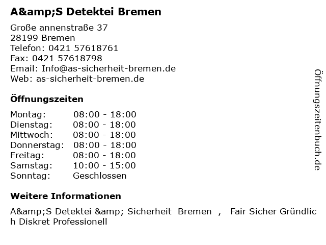| Öffnungszeiten A&S Detektei Bremen in Bremen anzeigen | |