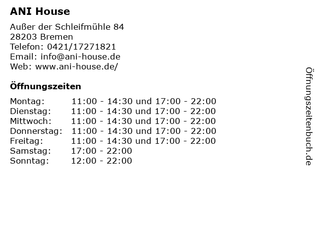 | Öffnungszeiten ANI House in Bremen anzeigen | |