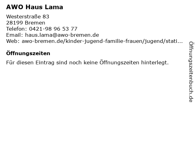 | Öffnungszeiten AWO Haus Lama in Bremen anzeigen | |