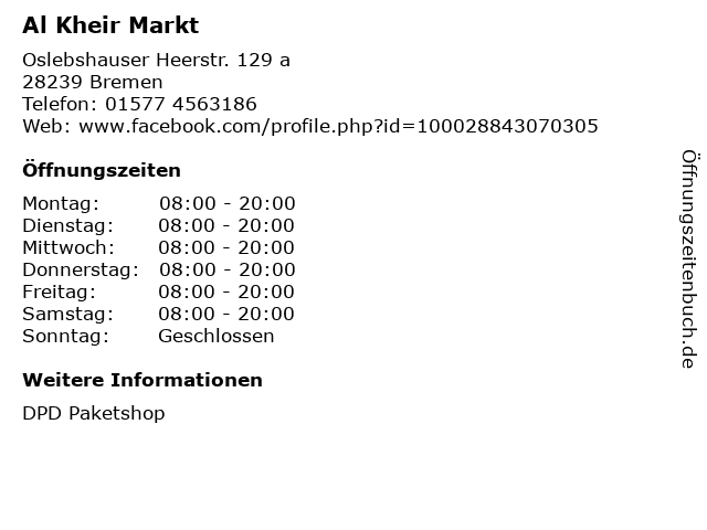 | Öffnungszeiten Al Kheir Markt in Bremen anzeigen | |