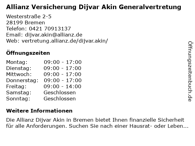 1 Allianz Versicherung Wehling und Lias OHG Generalvertretung (Entfernung: 0,83 km) Faulenstraße 25, 28195 Bremen 2 Allianz Versicherung Wehling und Lias OHG Generalvertretung (Entfernung: 0,84 km) Faulenstraße 25, 28195 Bremen 3 Allianz Versicherung Markus Behrends Generalvertretung (Entfernung: 2,07 km) Schifferstraße 15, 27568 Bremen 6 Allianz Versicherung Dr. Michael Klöckner Generalvertretung (Entfernung: 5,33 km) Föhrenstraße 35, 28207 Bremen |