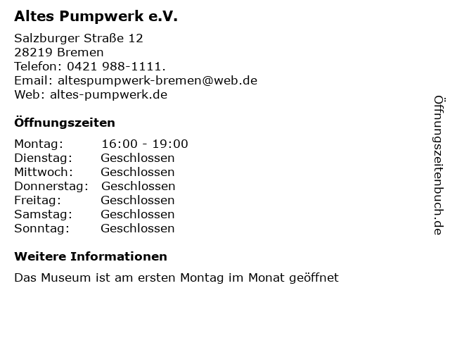 | Öffnungszeiten Altes Pumpwerk e.V. in Bremen anzeigen | |
