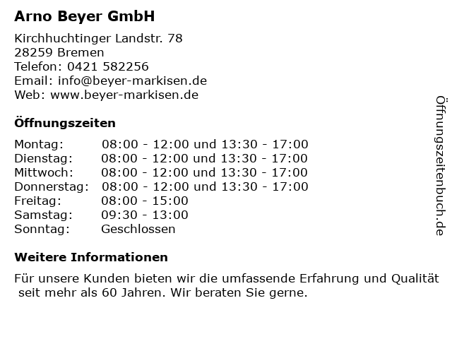 | Öffnungszeiten Arno Beyer GmbH in Bremen anzeigen | |