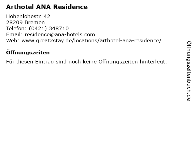 | Öffnungszeiten Arthotel ANA Residence in Bremen anzeigen | |