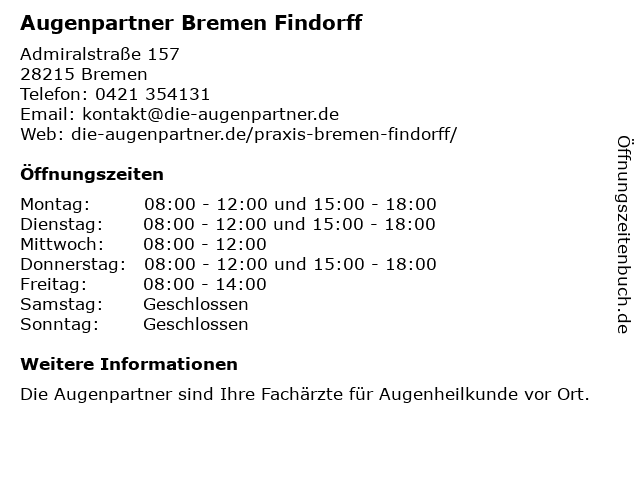 | Öffnungszeiten Augenpartner Bremen Findorff in Bremen anzeigen | |