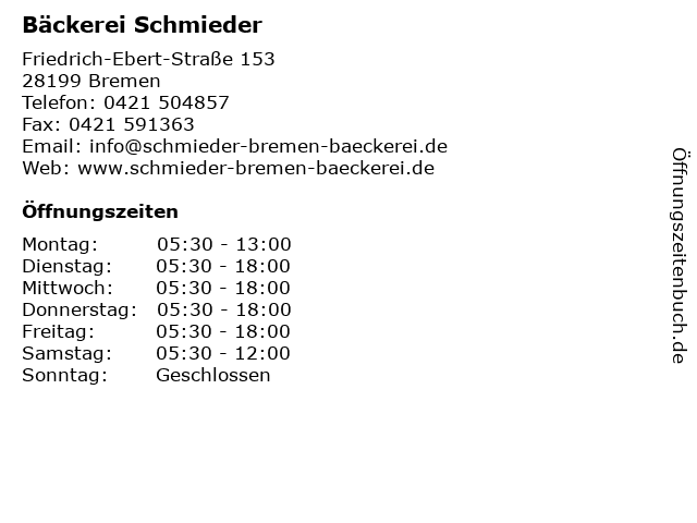 | Öffnungszeiten Bäckerei Schmieder in Bremen anzeigen | |