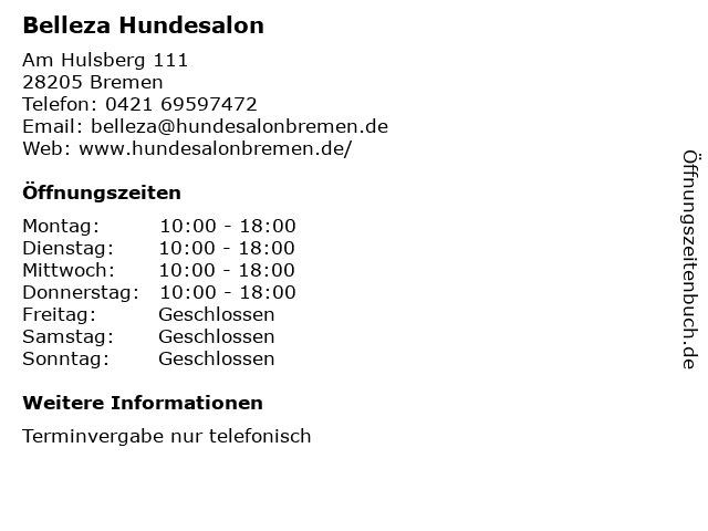 | Öffnungszeiten Belleza Hundesalon in Bremen anzeigen | |