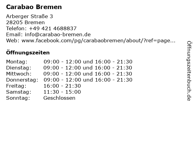 | Öffnungszeiten Carabao Bremen in Bremen anzeigen | |