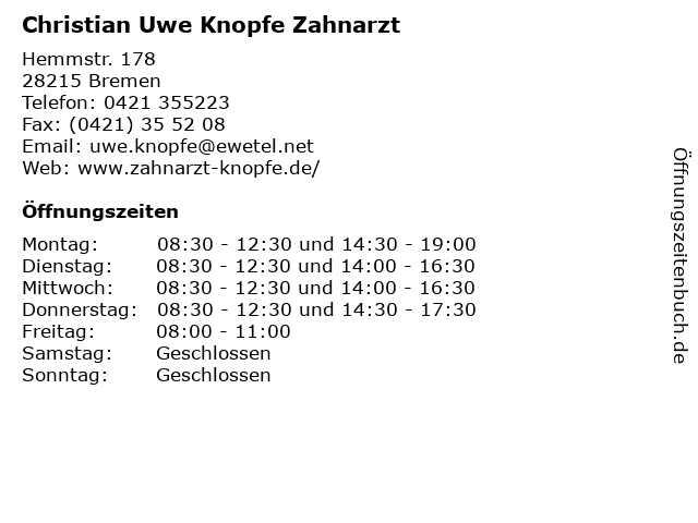 | Öffnungszeiten Christian Uwe Knopfe Zahnarzt in Bremen anzeigen | |