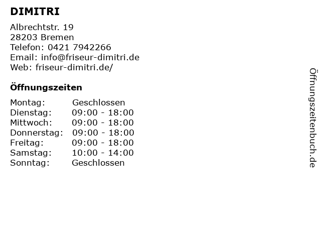 | Öffnungszeiten DIMITRI in Bremen anzeigen | |