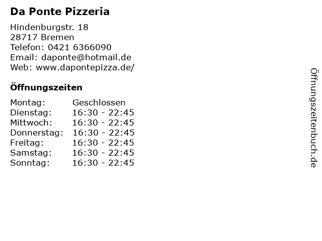 | Öffnungszeiten Da Ponte Pizzeria in Bremen anzeigen | |