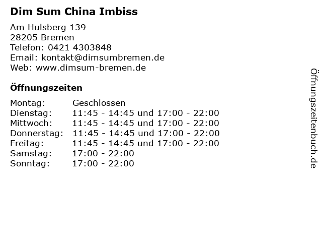 | Öffnungszeiten Dim Sum China Imbiss in Bremen anzeigen | |