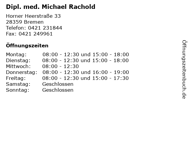 | Öffnungszeiten Dipl. med. Michael Rachold in Bremen anzeigen | |