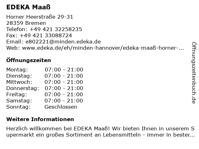 | Öffnungszeiten EDEKA Maaß in Bremen anzeigen | |
