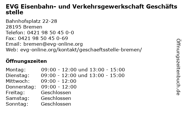 1 Eisenbahn- und Verkehrsgewerkschaft (EVG) Geschäftsstelle (Entfernung: 0,15 km) Rembertiring 13, 28195 Bremen 6 |