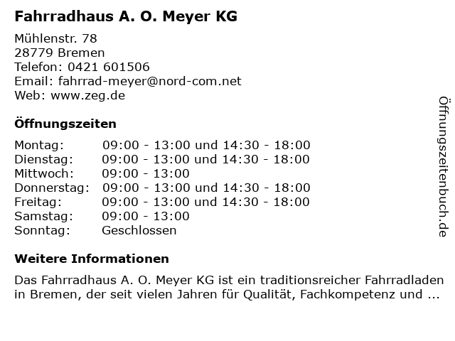 | Öffnungszeiten Fahrradhaus A. O. Meyer KG in Bremen anzeigen | |