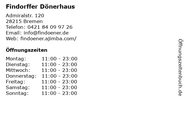 | Öffnungszeiten Findorffer Dönerhaus in Bremen anzeigen | |