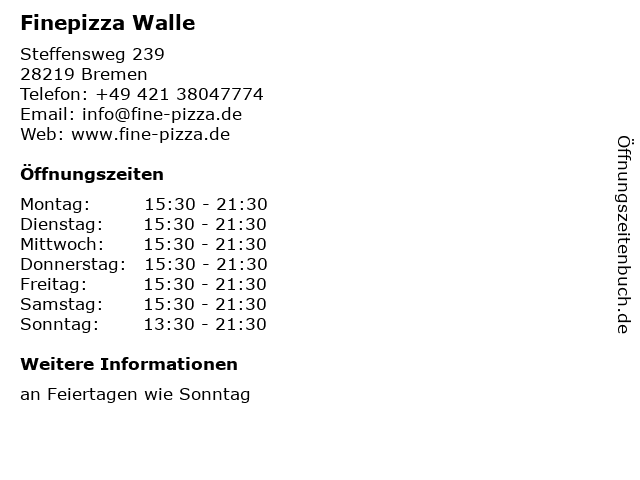| Öffnungszeiten Finepizza Walle in Bremen anzeigen | |
