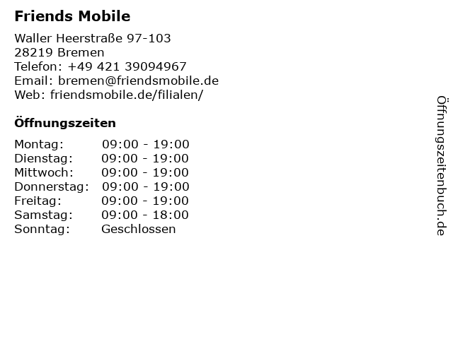 | Öffnungszeiten Friends Mobile in Bremen anzeigen | |