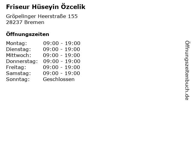 | Öffnungszeiten Friseur Hüseyin Özcelik in Bremen anzeigen | |
