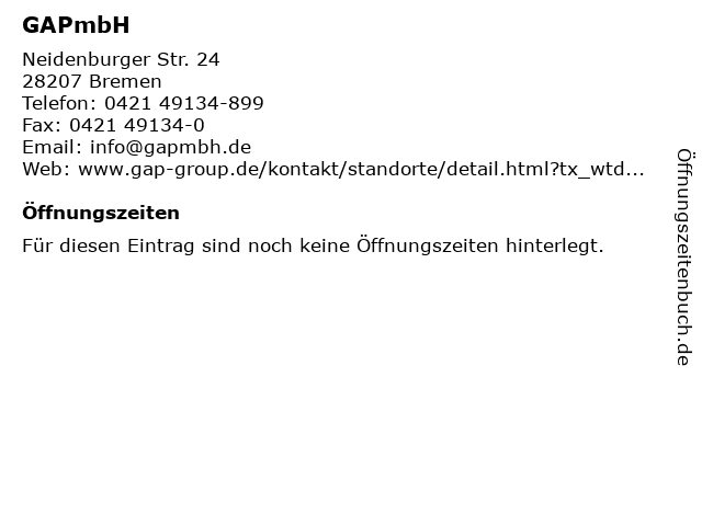 | Öffnungszeiten GAPmbH in Bremen anzeigen | |