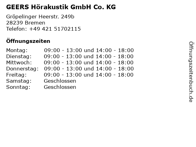 | Öffnungszeiten GEERS Hörakustik GmbH Co. KG in Bremen anzeigen | |