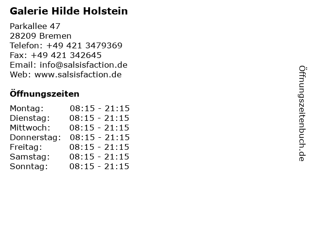 | Öffnungszeiten Galerie Hilde Holstein in Bremen anzeigen | |