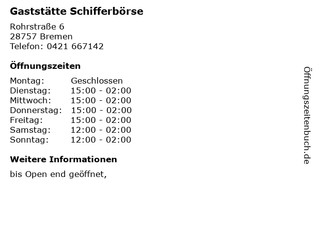 | Öffnungszeiten Gaststätte Schifferbörse in Bremen anzeigen | |