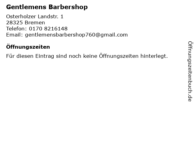 | Öffnungszeiten Gentlemens Barbershop in Bremen anzeigen | |