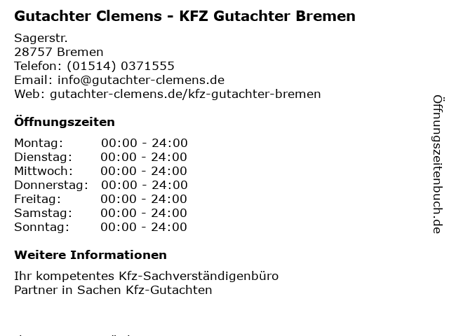 1 Nora Hinkelmann-Kieseler & Clemens Tschorn Zahnarztpraxis (Entfernung: 3,41 km) Lesumer Heerstraße 46 – 50b, 28717 Bremen 4 Frauenheilkunde und Geburtshife Praxis Gertrud Hoeck-Clemens (Entfernung: 6,98 km) Ostlandstrasse 51, 28790 Schwanewede 5 Justizvollzugsanstalt Bremen (Mandantenbesuch durch Rechtsanwälte, Vollzugshelfer, Gutachter) (Entfernung: 9,39 km) Am Fuchsberg 3, 28239 Bremen 6 KFZ-Sachverständigenbüro Rieger KFZ-Gutachter (Entfernung: 13,30 km) Bremer Straße 61, 27749 Delmenhorst |