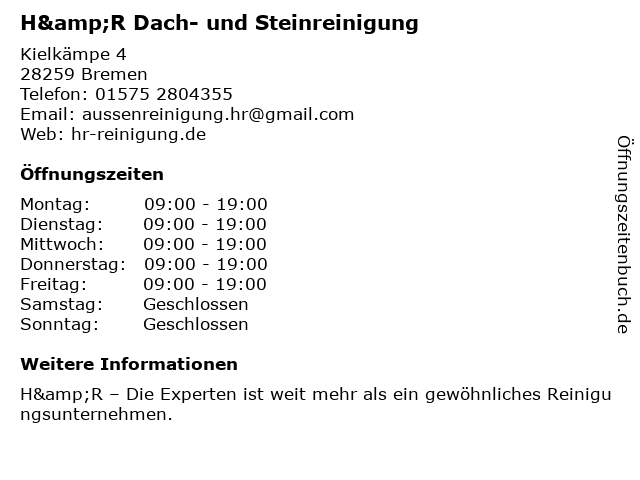 | Öffnungszeiten H&R Dach- und Steinreinigung in Bremen anzeigen | |