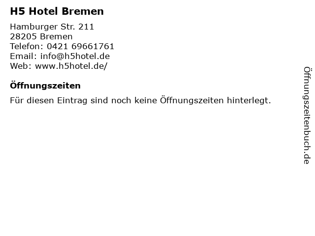 | Öffnungszeiten H5 Hotel Bremen in Bremen anzeigen | |