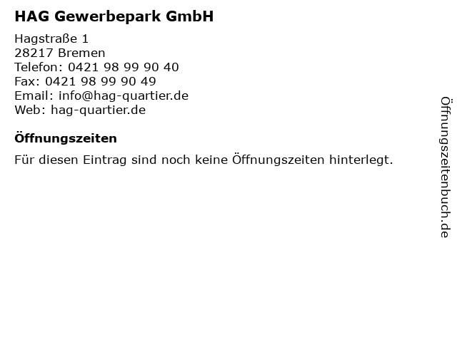 | Öffnungszeiten HAG Gewerbepark GmbH in Bremen anzeigen | |