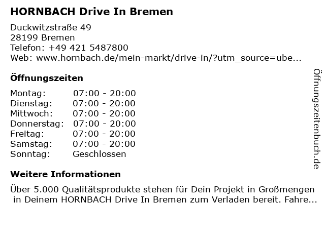 | Öffnungszeiten HORNBACH Drive In Bremen in Bremen anzeigen | |
