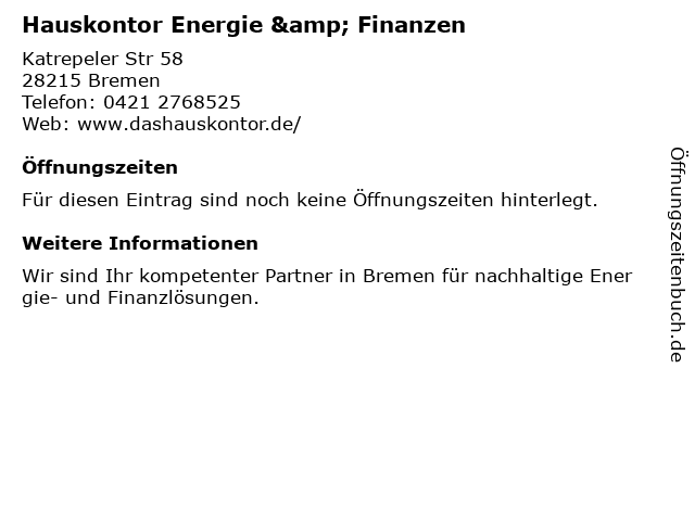 | Öffnungszeiten Hauskontor Energie & Finanzen in Bremen anzeigen | |