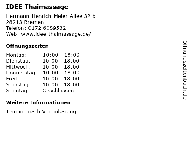 | Öffnungszeiten IDEE Thaimassage in Bremen anzeigen | |