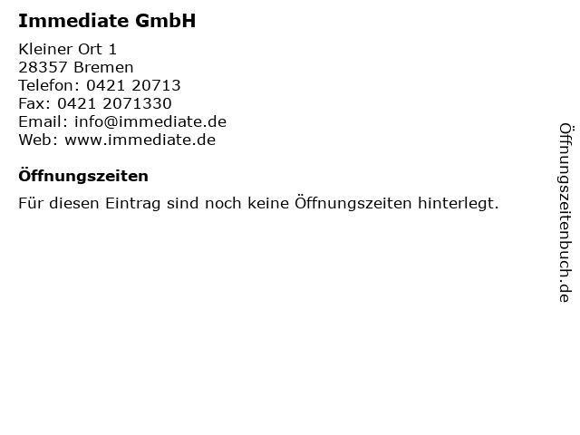 | Öffnungszeiten Immediate GmbH in Bremen anzeigen | |