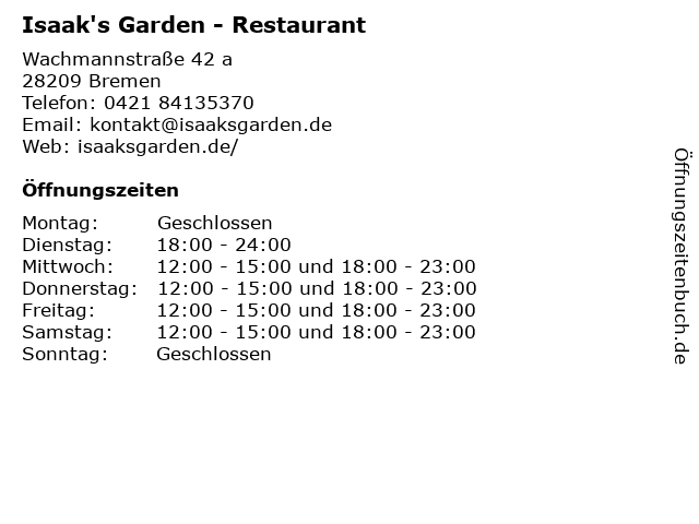 | Öffnungszeiten Isaak's Garden - Restaurant in Bremen anzeigen | |