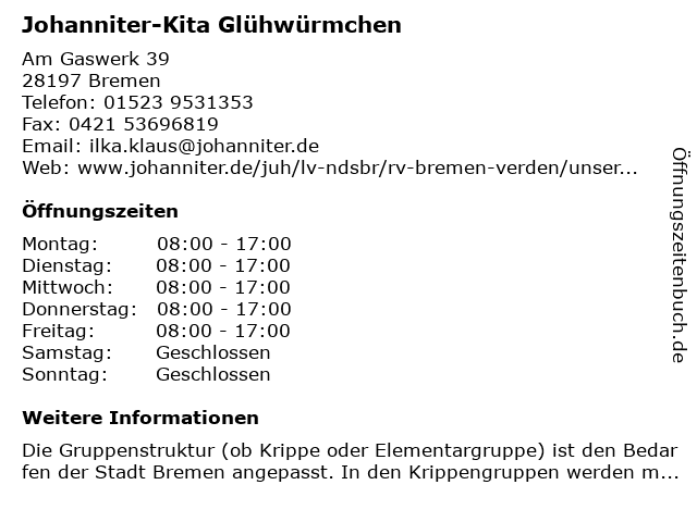 | Öffnungszeiten Johanniter-Kita Glühwürmchen in Bremen anzeigen | |