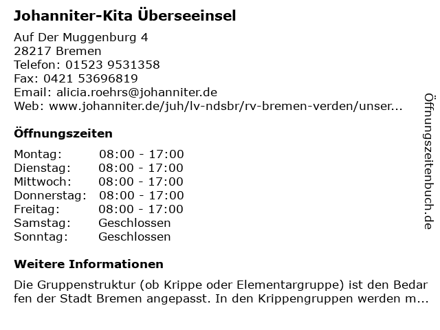 | Öffnungszeiten Johanniter-Kita Überseeinsel in Bremen anzeigen | |