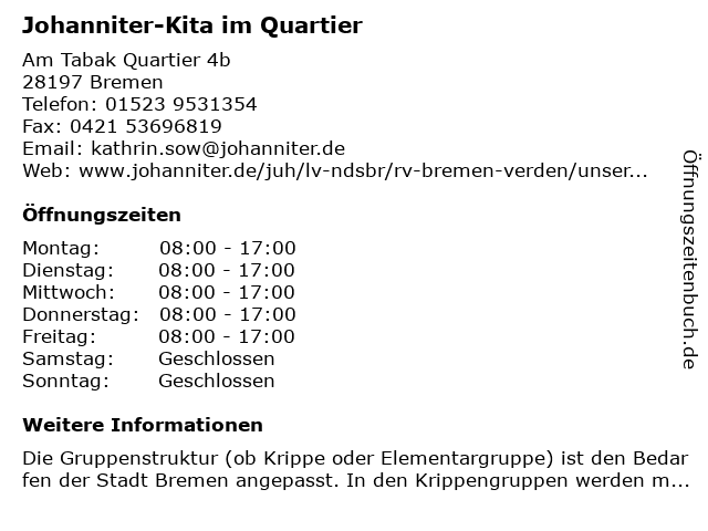 | Öffnungszeiten Johanniter-Kita im Quartier in Bremen anzeigen | |